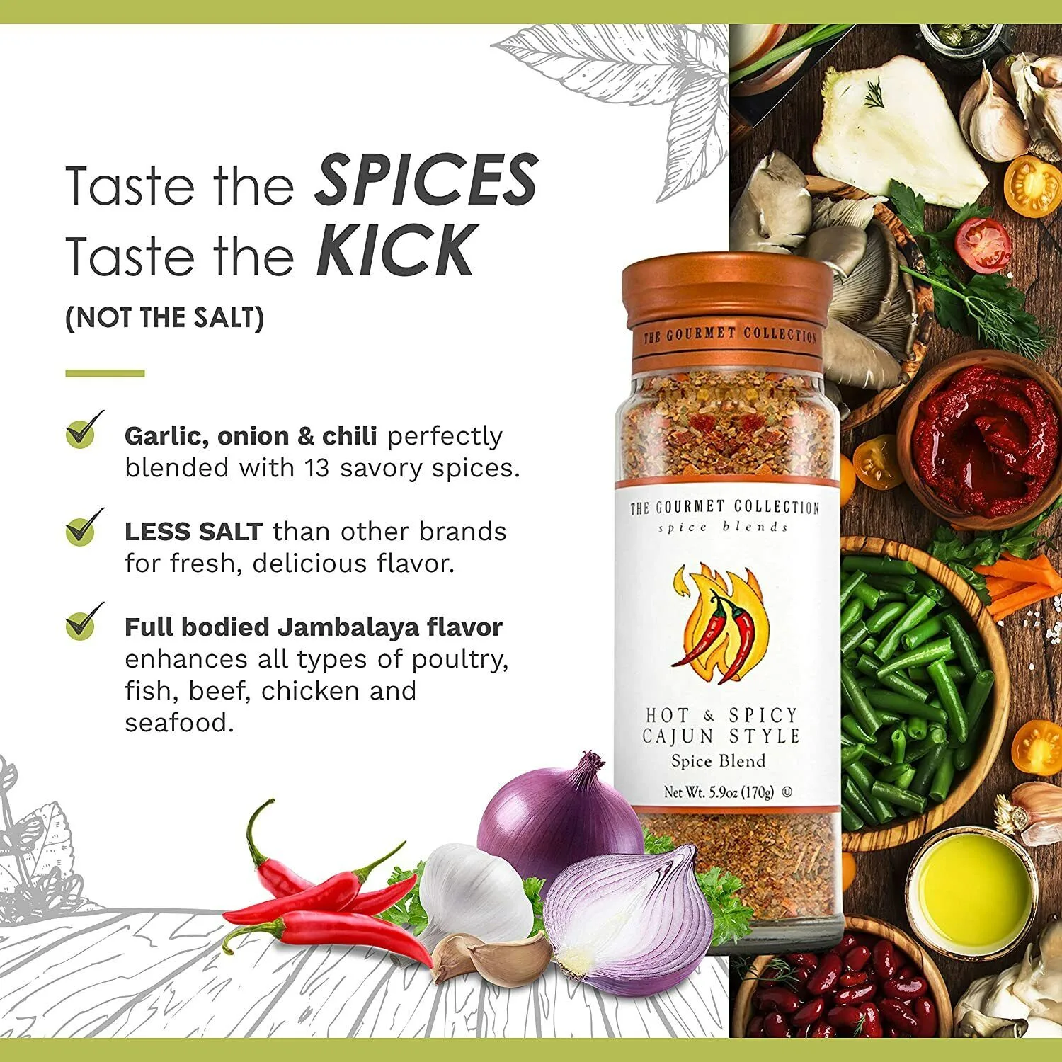 - ★ The Gourmet Collection’s Hot Cajun Spice Blend will bring New Orleans to your table! Take your jambalaya to the next level with chili, onion, garlic & a blend of 14 spices. It’s the perfect amount of heat!